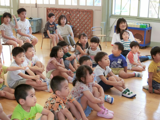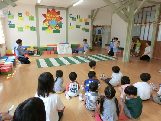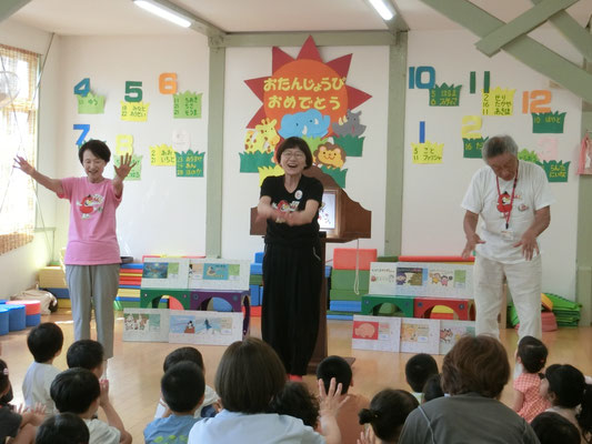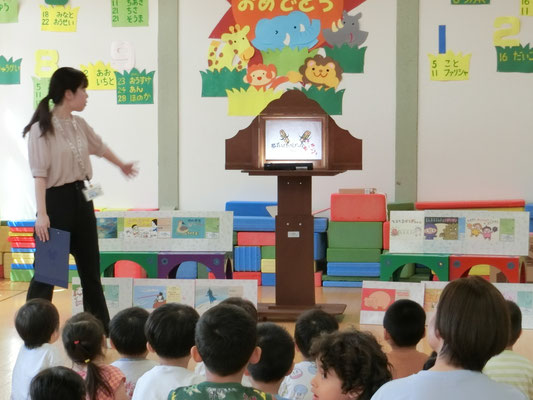 紙芝居舞台や拍子木、12冊の紙芝居の寄贈式が行われました。大切に使わせていただきます。